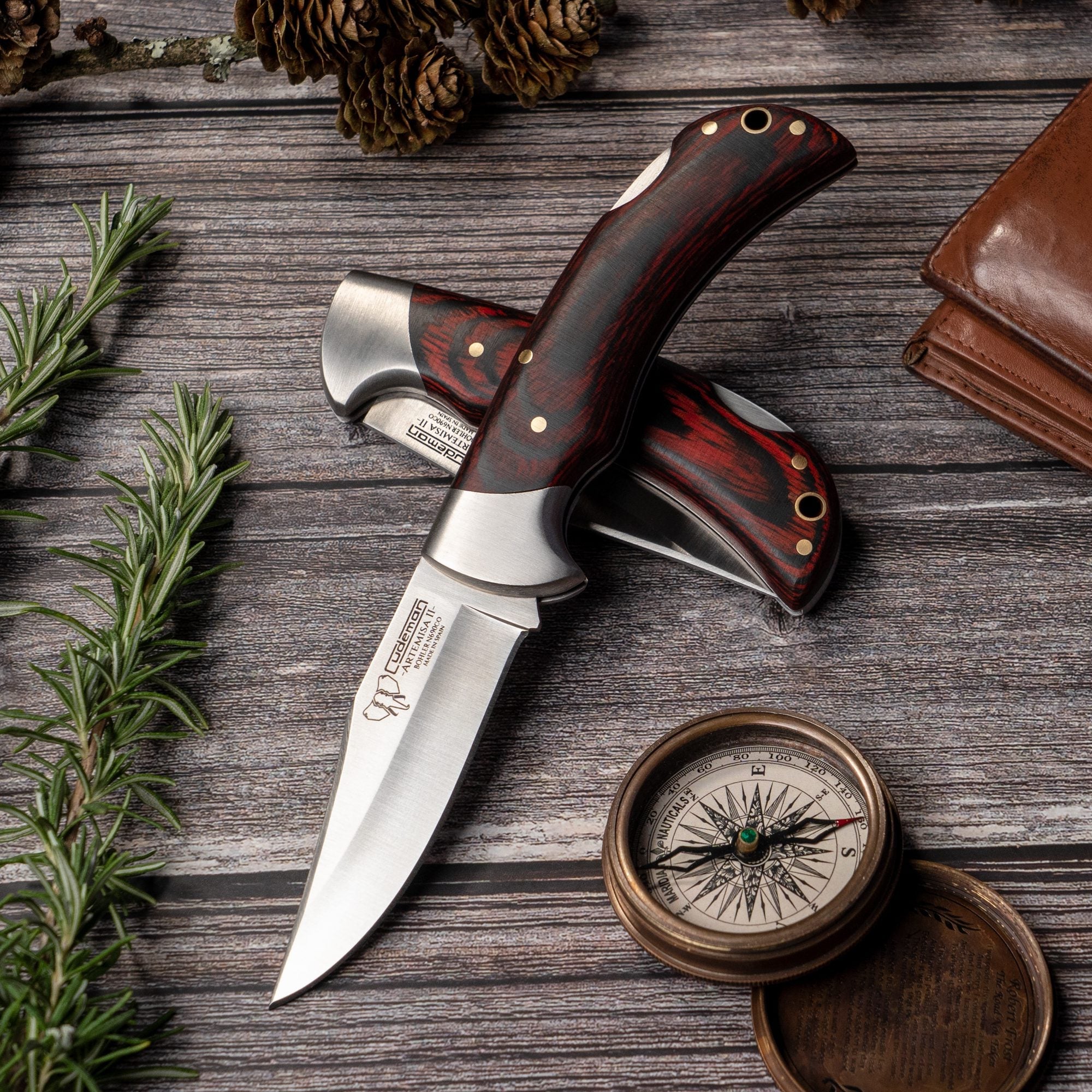 Handle Material: Crafted from polished red stamina wood, providing a comfortable grip and a striking aesthetic.