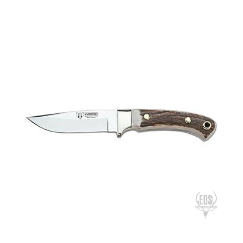 Cudeman Skinner 10cm Clip Point Blade, Polished Deer Antler Handle, Gold Tang / Leather Sheath