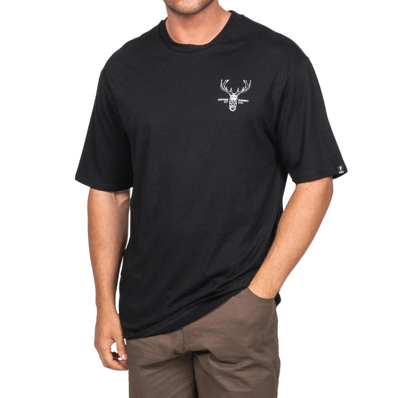 The Alpha Tee from Hunters Element is a premium crew neck t-shirt featuring original artwork and a relaxed fit tailored for outdoor enthusiasts. Built from a 65% recycled cotton / 35% cotton blend, it offers breathable comfort and sun protection with a UPF50+ rating.