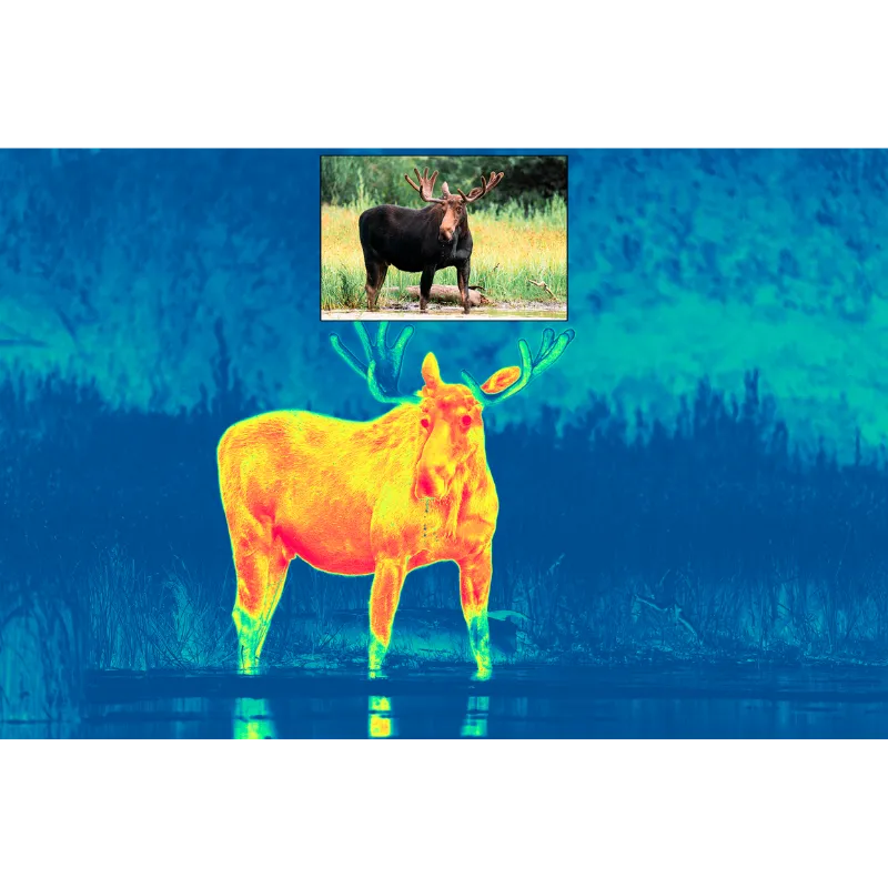Sharp, richly contrasted thermal imaging for enhanced identification of animals, their extremities and even the smallest details, i.e. branches, leaves, grass and terrain.